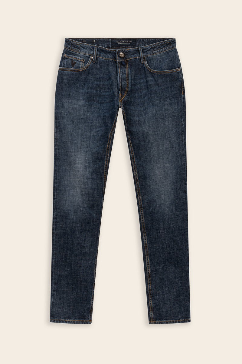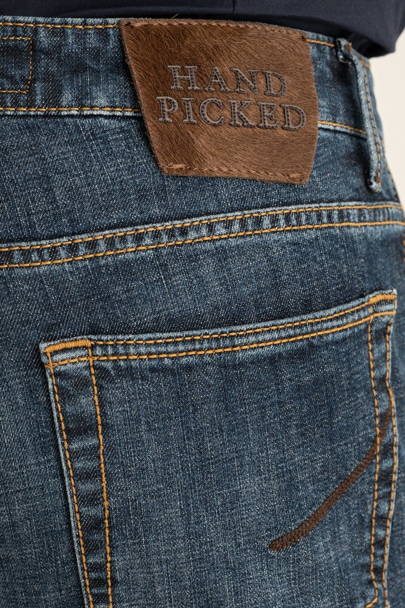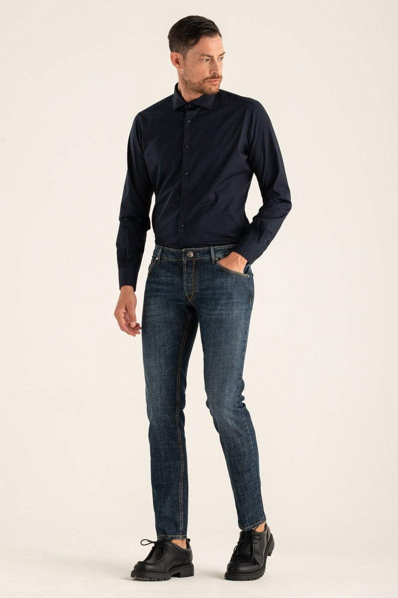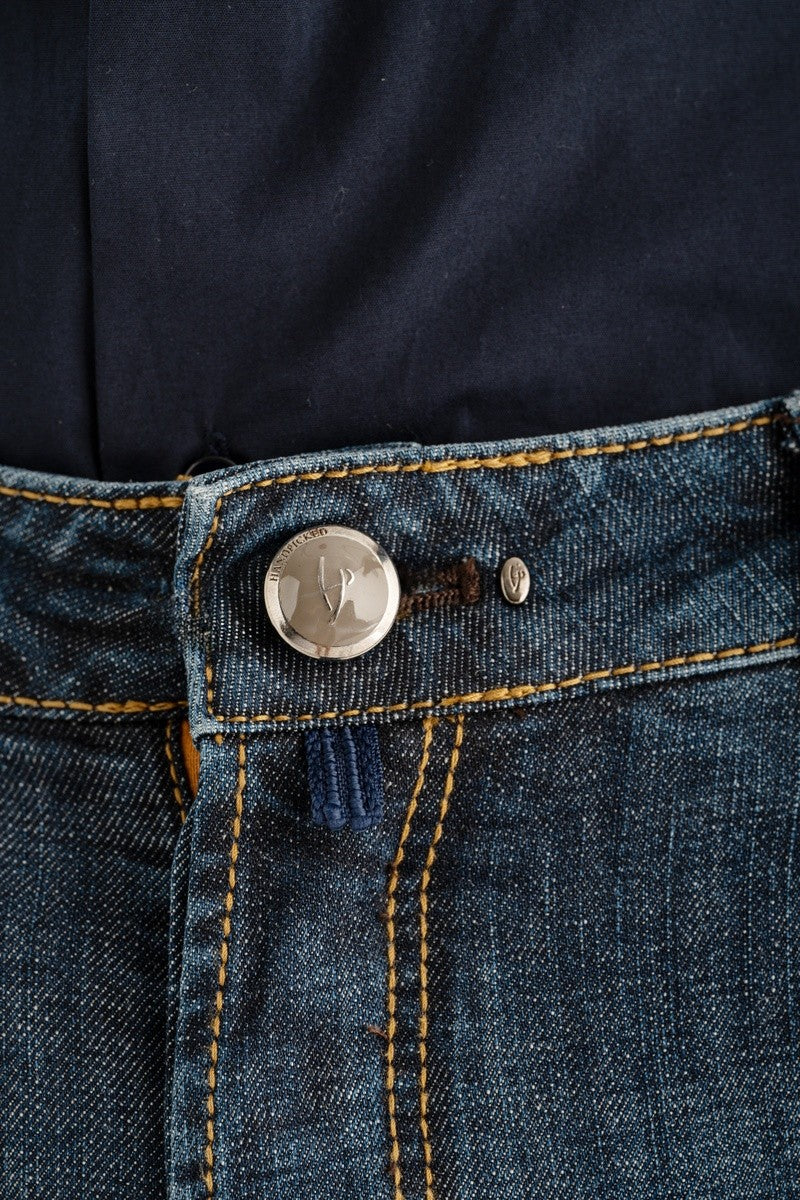 Pants 5 pockets with buttons to nails, in blue stretch denim 10.5 oz, salpa logata and wash medium stone bleached, slim fit, inside leg 86 cm and bottom 17,5 cm on size 33.