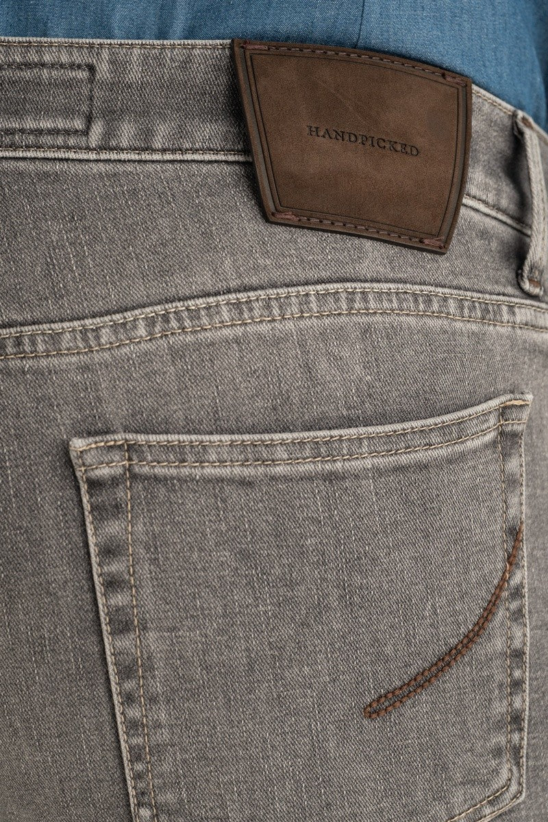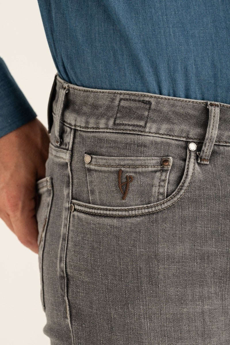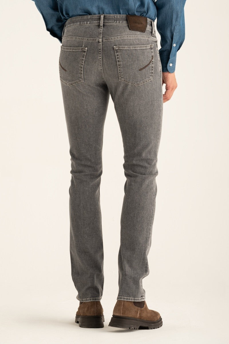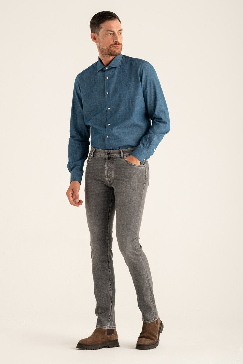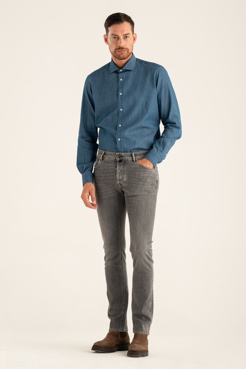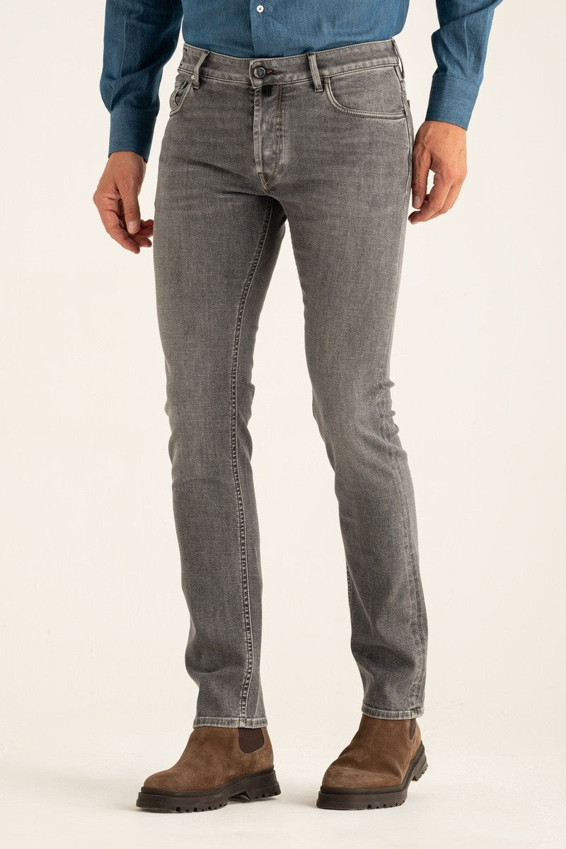 Pants 5 pockets with enamelled and branded nail buttons, in black stretch denim 10 oz, nubuck waistband and clear wash, regular fit, inside leg 86 cm and bottom 18.8 cm on size 33.