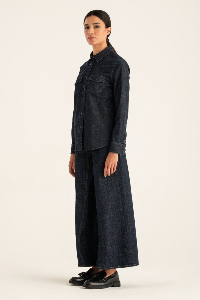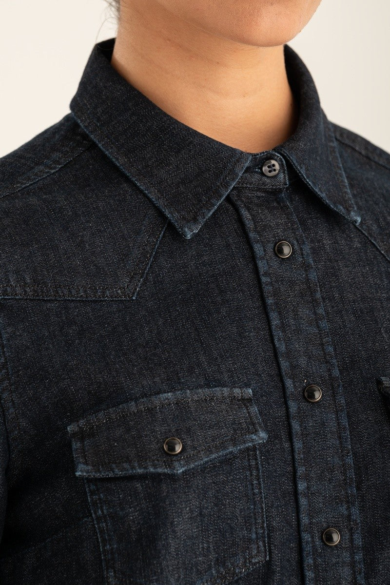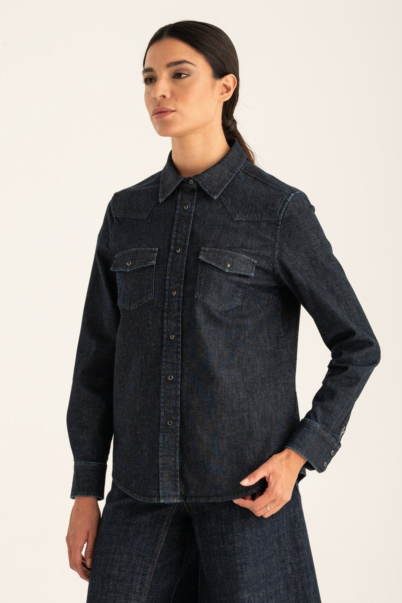 Regular fit western shirt, in light blue cotton denim and tencel 7.5 oz, dark wash, with press buttons and 4-hole mother of pearl button detail on the collar.