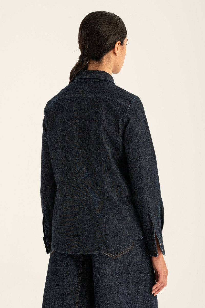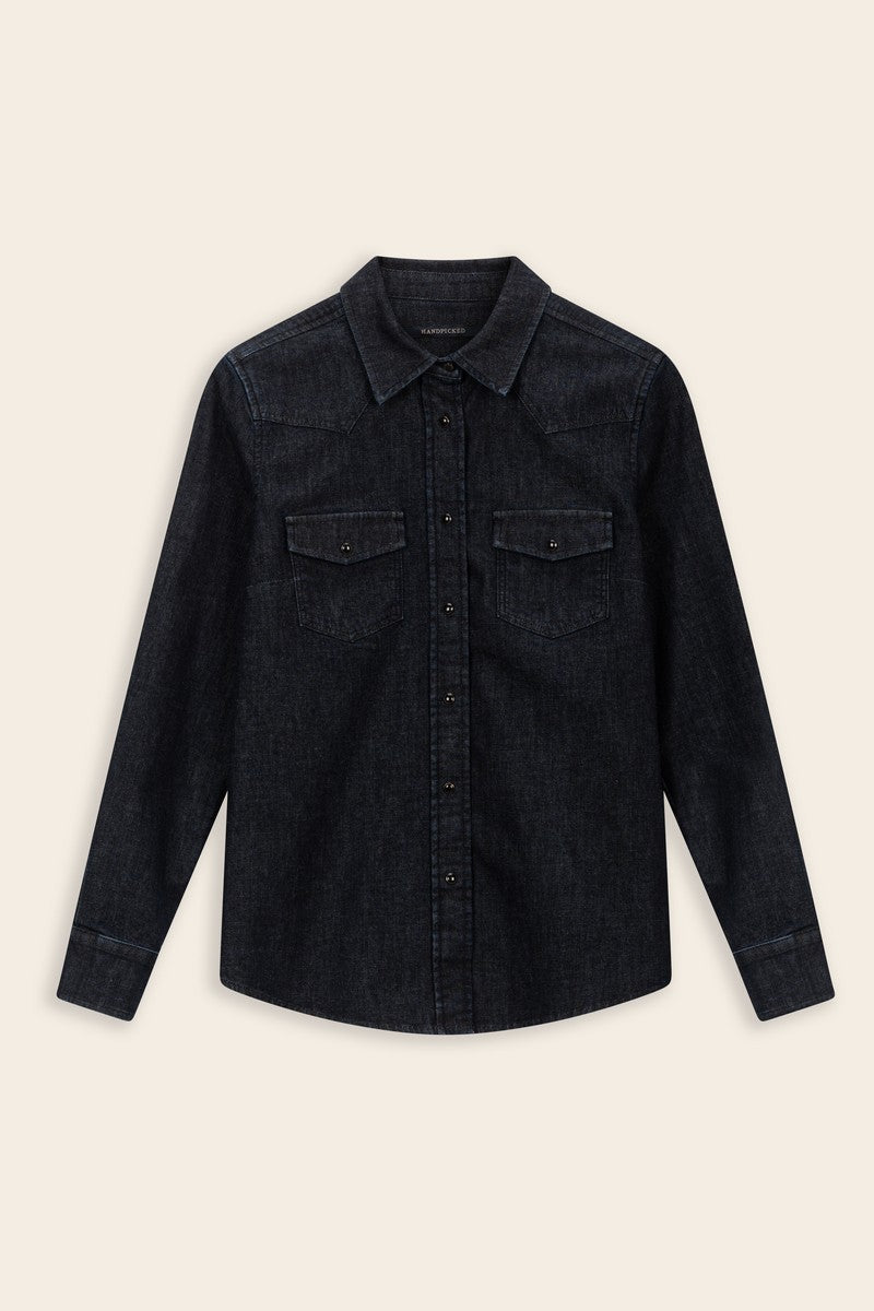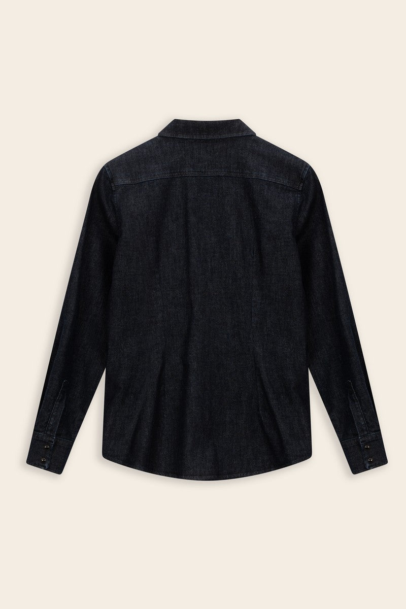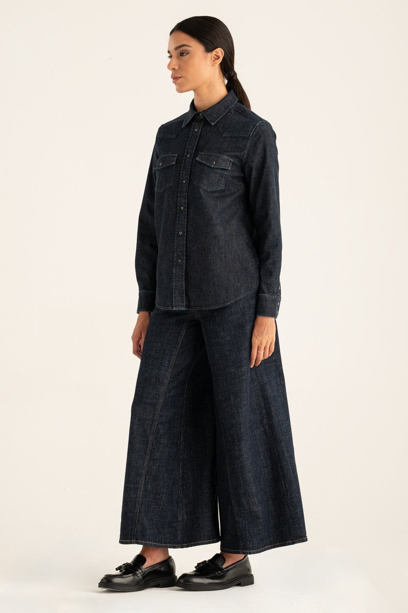 Regular fit western shirt, in light blue cotton denim and tencel 7.5 oz, dark wash, with press buttons and 4-hole mother of pearl button detail on the collar.