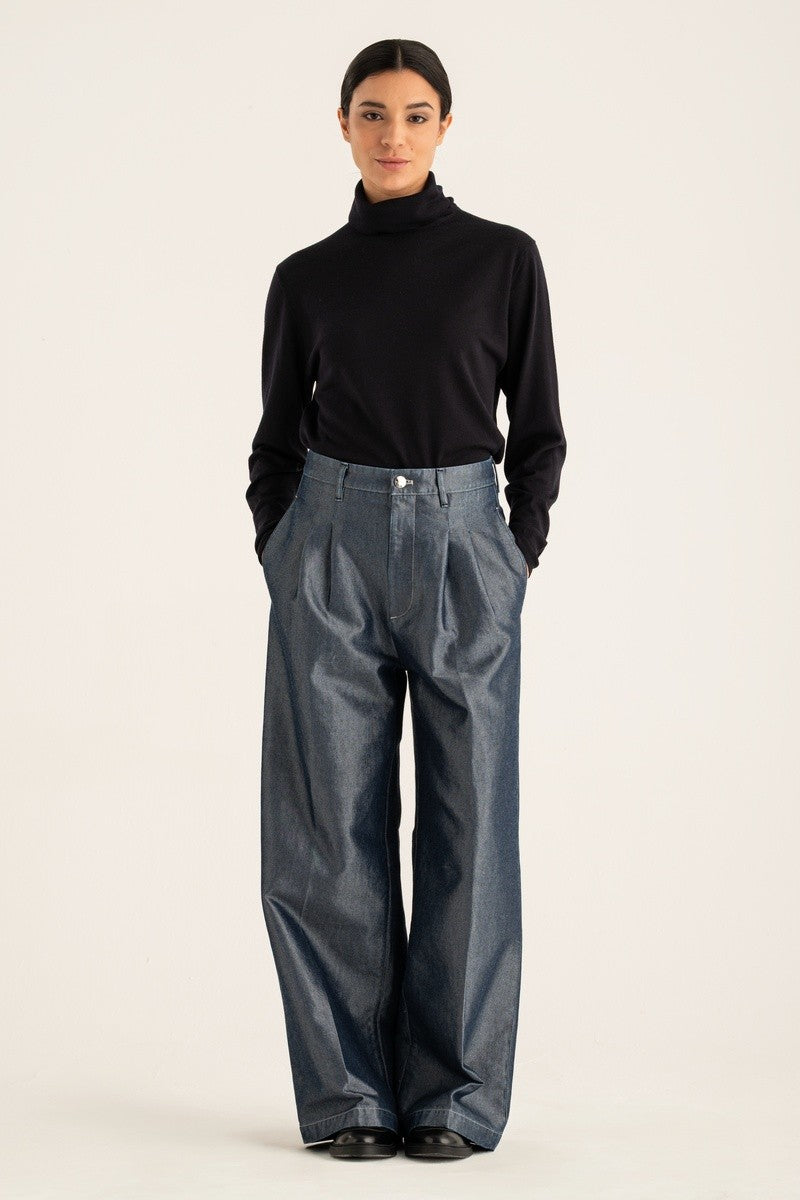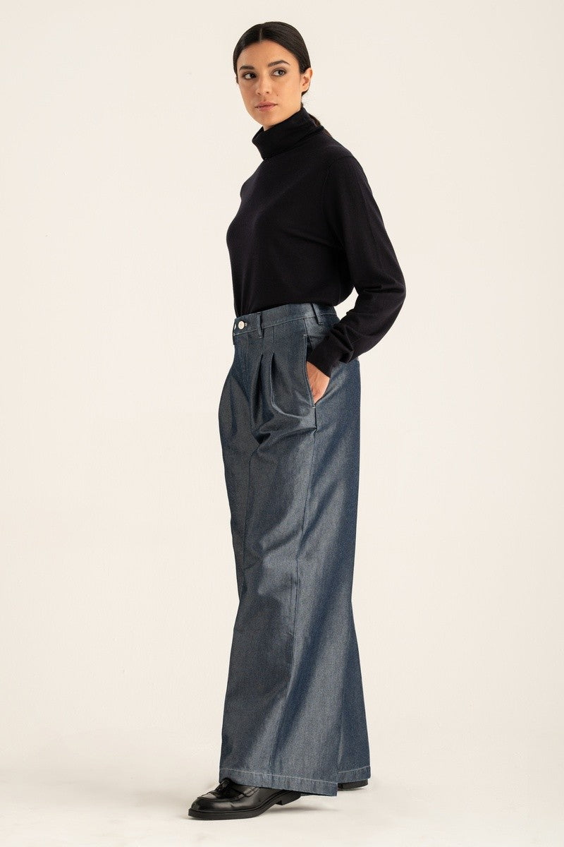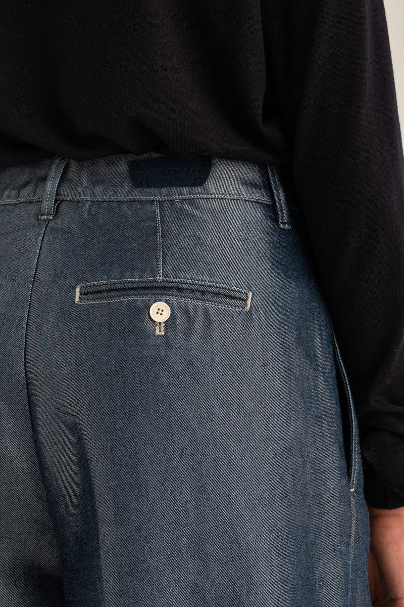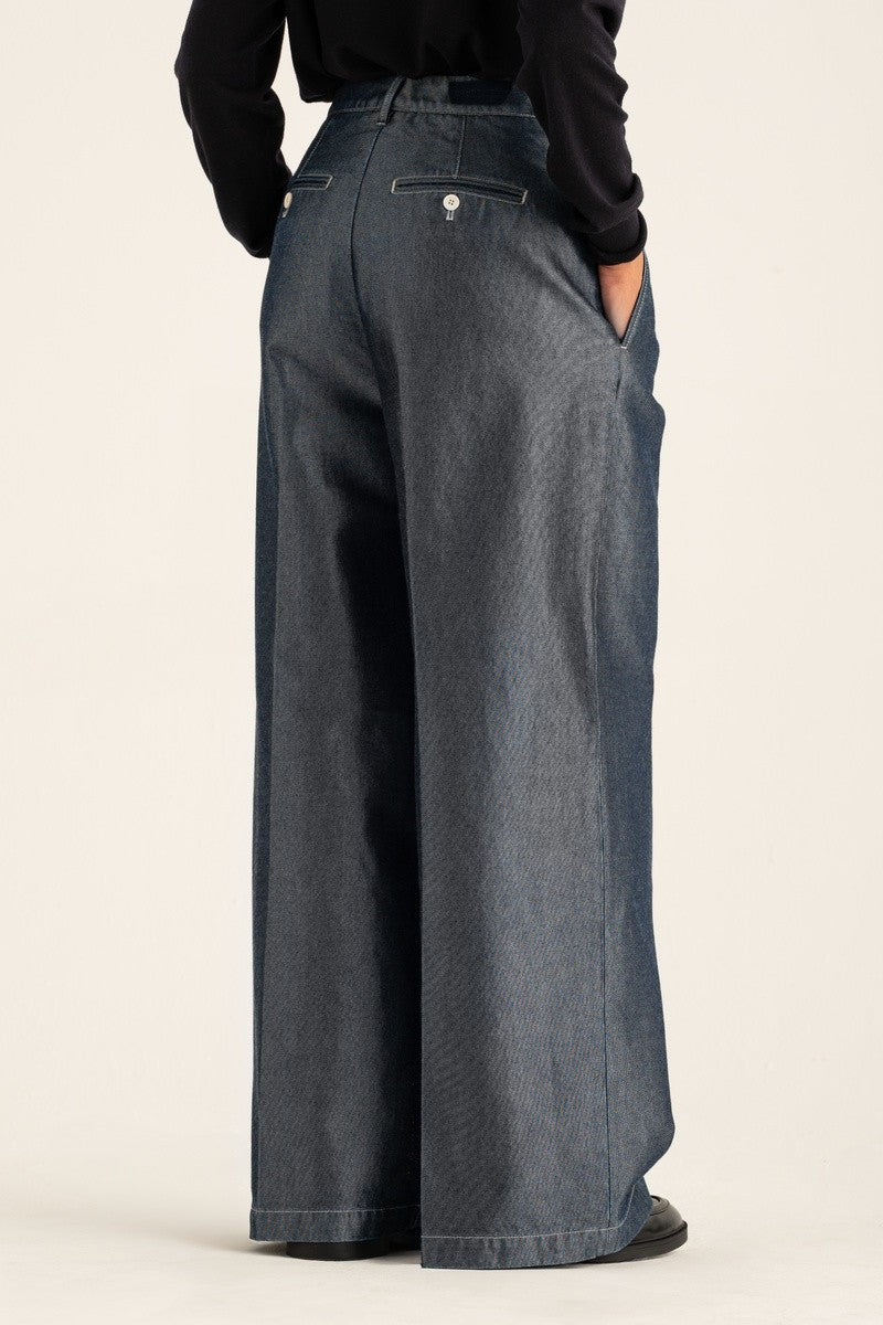 Pantalone chino palazzo, vita alta, chiusura con zip e bottone 4 fori logato e salpa couture, in denim blu 11 oz, lavaggio scuro. Lunghezza interno gamba 77 cm sulla taglia 26.