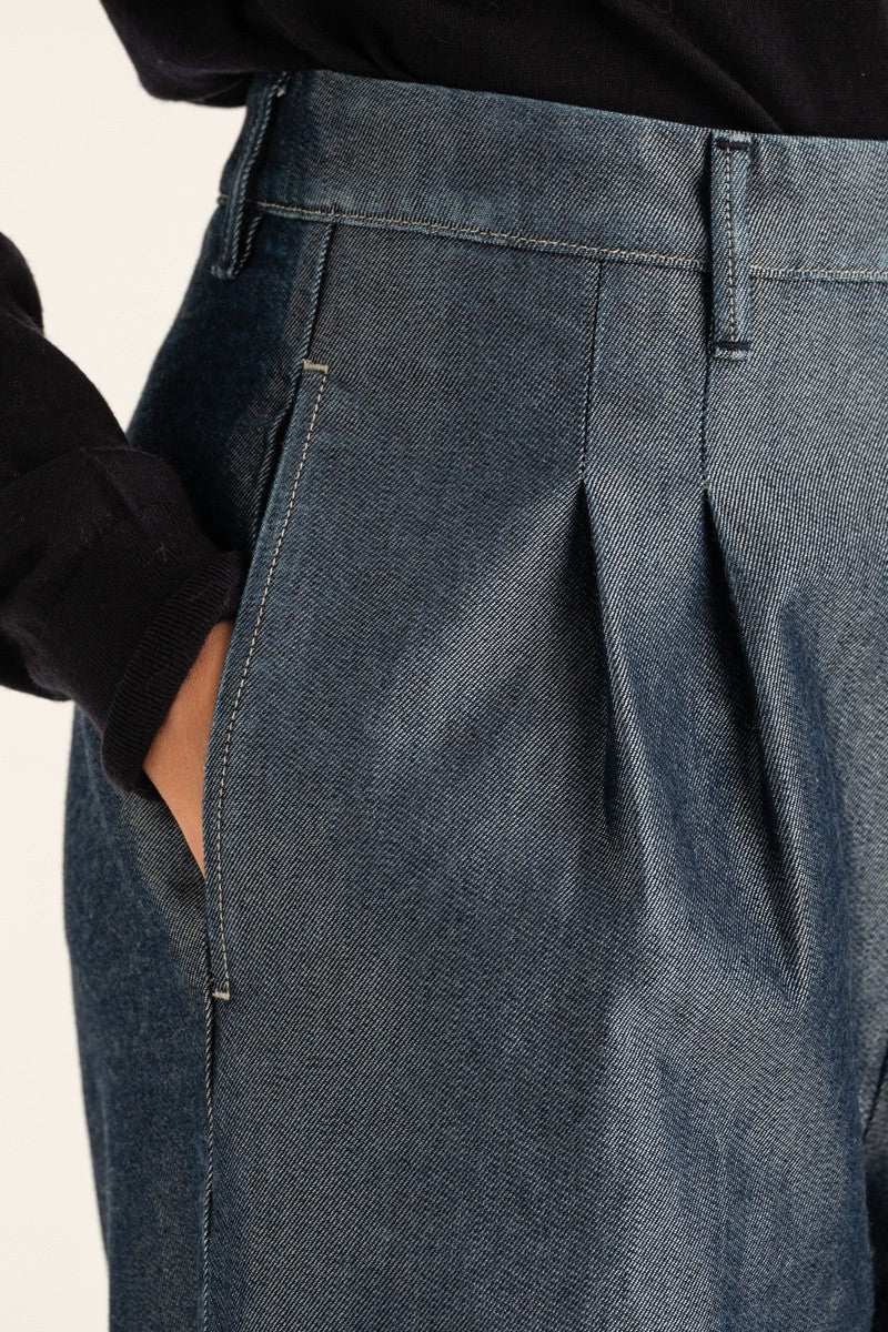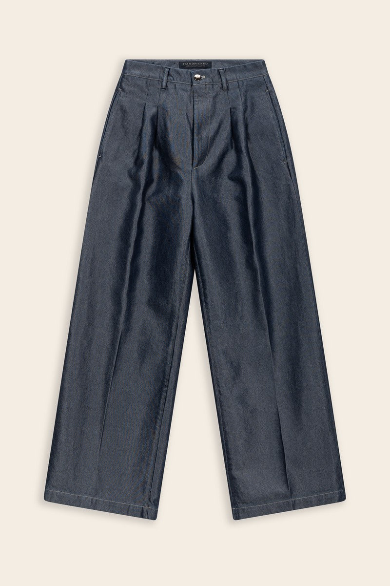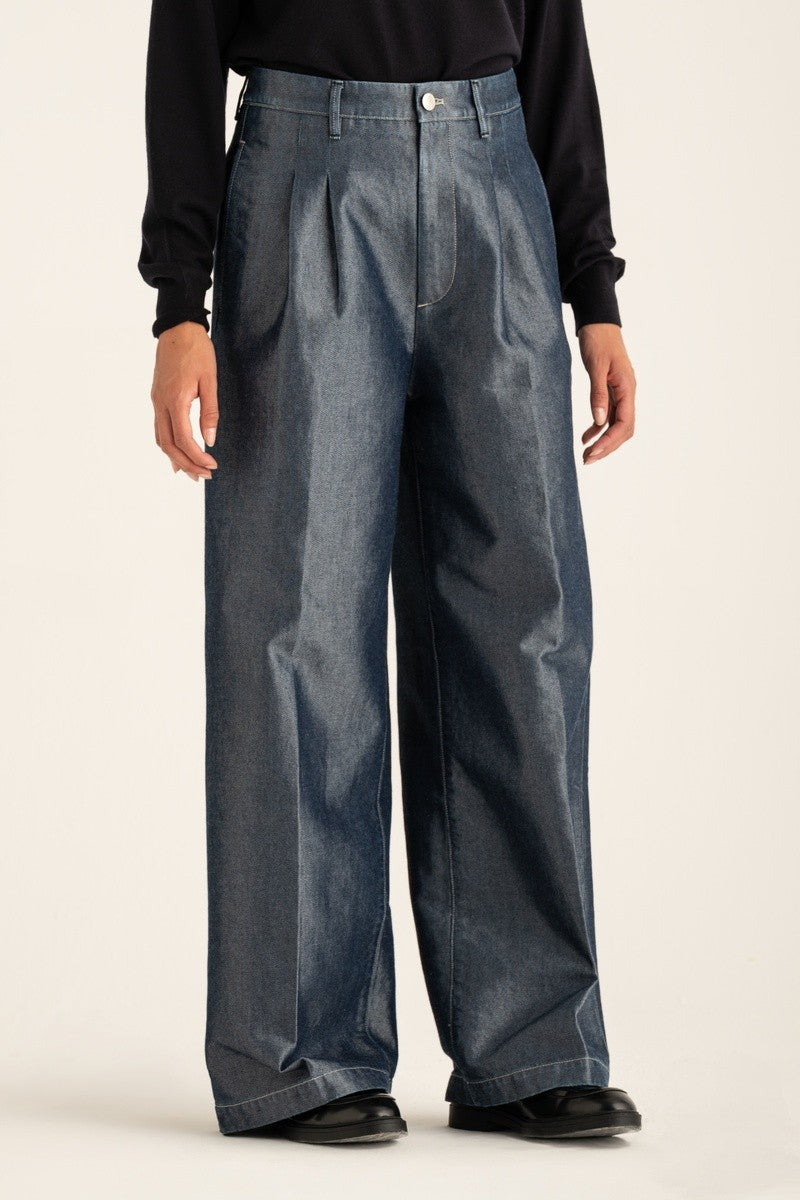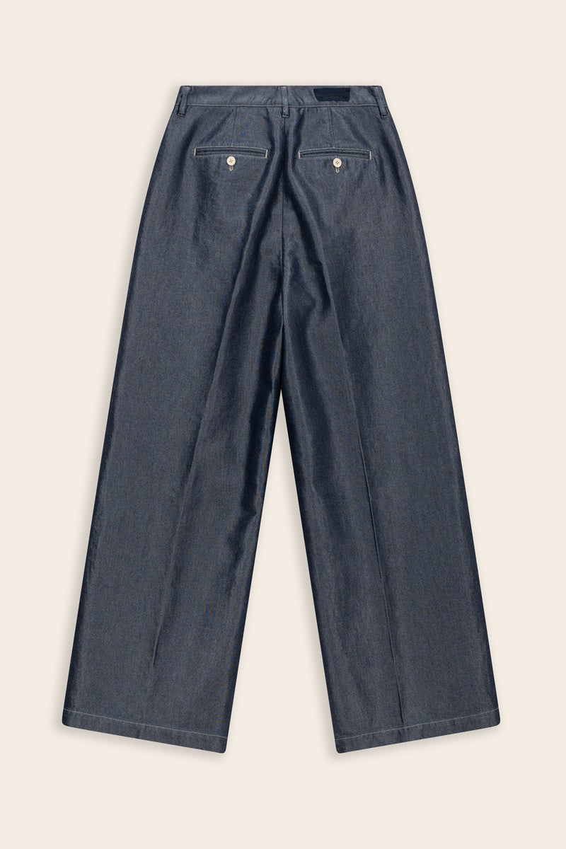 Pantalone chino palazzo, vita alta, chiusura con zip e bottone 4 fori logato e salpa couture, in denim blu 11 oz, lavaggio scuro. Lunghezza interno gamba 77 cm sulla taglia 26.
